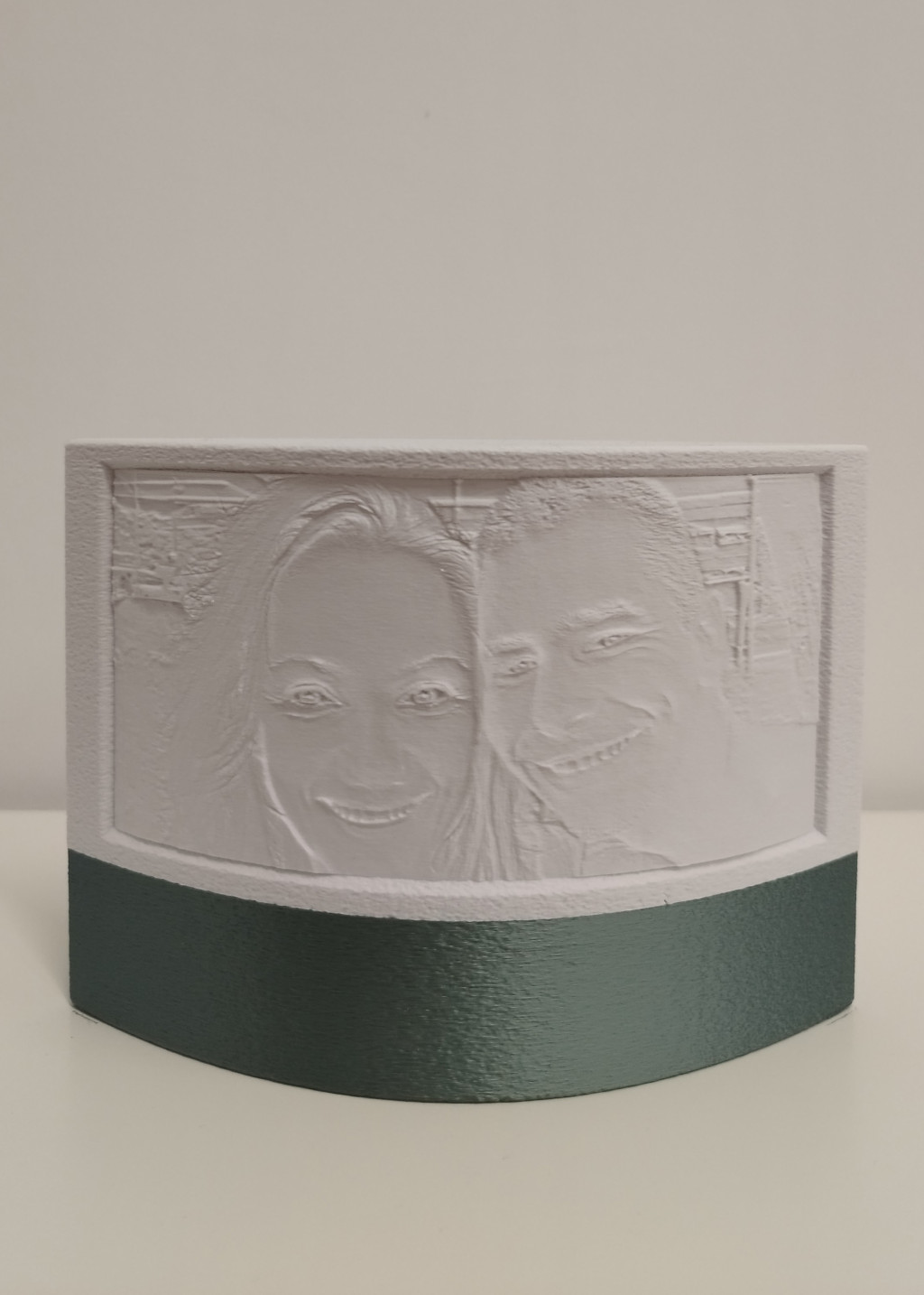 Szem alakú forma, melynek az elejére kérhető fénykép. Hátulja finoman szemcsézett, esztétikus megjelenésű. A benne lévő lámpa 5V-os telefontöltőről üzemeltethető, melynek fényereje és színhőmérséklete is változtatható. Hideg, meleg és természetes fények közül választhatunk. A lámpa alja 9 különböző színben érhető el.